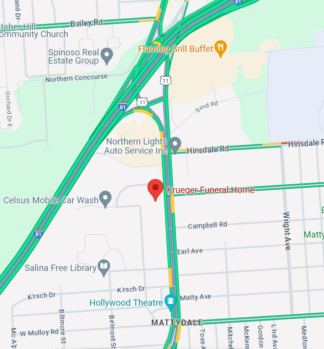 Take 81N to Rt 11/Brewerton Rd get off at Mattydale exit turn right on to RT 11/Brewerton Rd, we are on the right just pass the second stop light